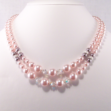 Swarovski crystal pearls 10m to 6m Swarovski crystals 6m and 4m bicones Strand spacers .925 sterling silver turkish silver caps stardust rondelles hook & eye fastener(slight variations) findings price: starts $61.00