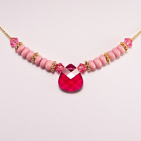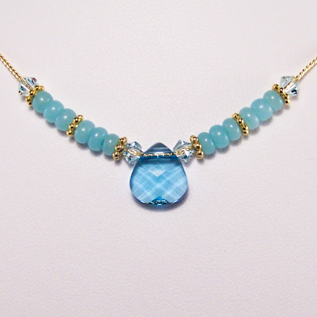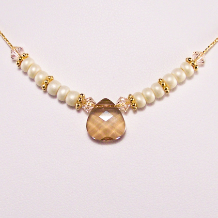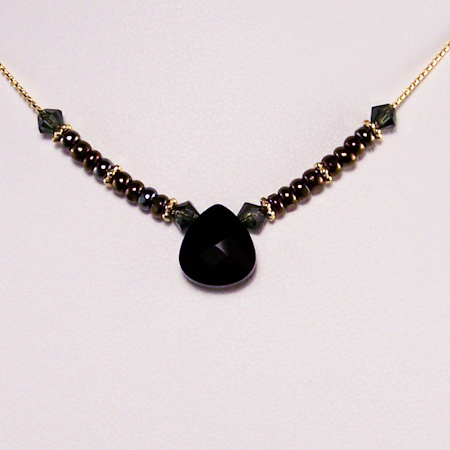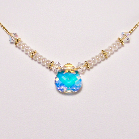 materials: | Swarovski crystal 11x10mmm brio 4m bicones Seed beads, charlottes Lead-free pewter findings Gold plate chain & findings measures: 15-18 inches price: $25.00  |  | |||