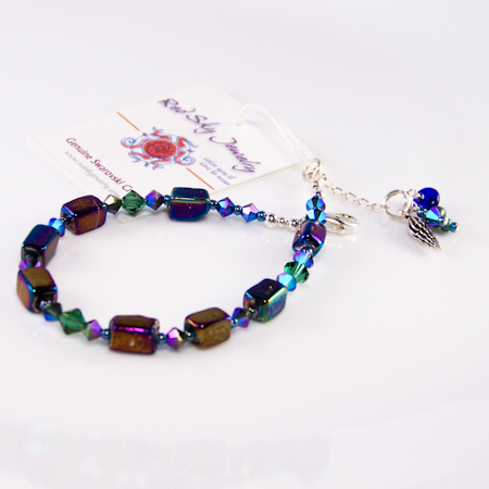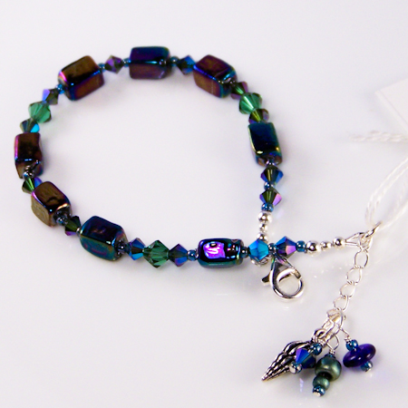 Raku beads Swarovski crystals 5m and 4m bicones Japanese seed beads Lead-free pewter spacers, charm .925 sterling silver findings measures: to 7.5 inches price: $40.00