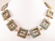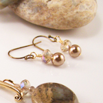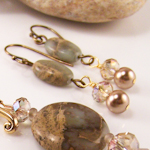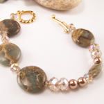 | materials: Aqua terra jasper 25m x 25m Crystal rondelles Farfalle beads Antique brass findings & extension chain |